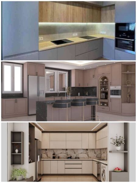 مدرن و مینیمال: استفاده از دستگیرههای مخفی، سطوح صاف و یکدست، رنگهای خنثی (سفید، مشکی، خاکستری) و مصالحی مانند هایگلاس یا MDF لاکخورده.